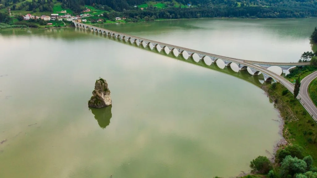 Lacul, cu o formă alungită, pe direcția nord-vest – sud-est, are o suprafață de 32,6 km² și s-a format după construirea între anii 1950 și 1960 a unui baraj care alimentează hidrocentrala de 210 MW construită în timpul regimului comunist inclusiv cu aportul muncii forțate prestate de deținuți politici. Pentru construcția barajului și amenajarea lacului au fost strămutate 22 de sate din zonă, și peisajul natural a fost drastic schimbat, el fiind declarat rezervație naturală acvatică în 2000.